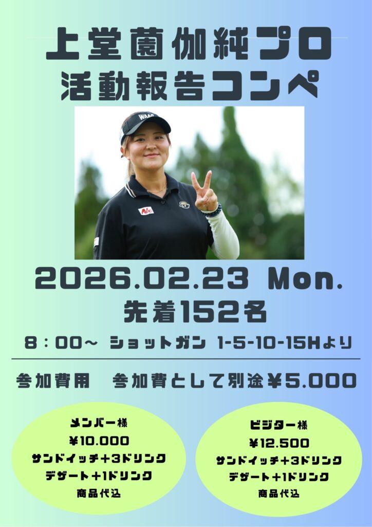 日本ラインゴルフ倶楽部の所属プロ、上堂薗伽純プロの1年間の活躍を祝して、活動報告コンペを開催いたします!