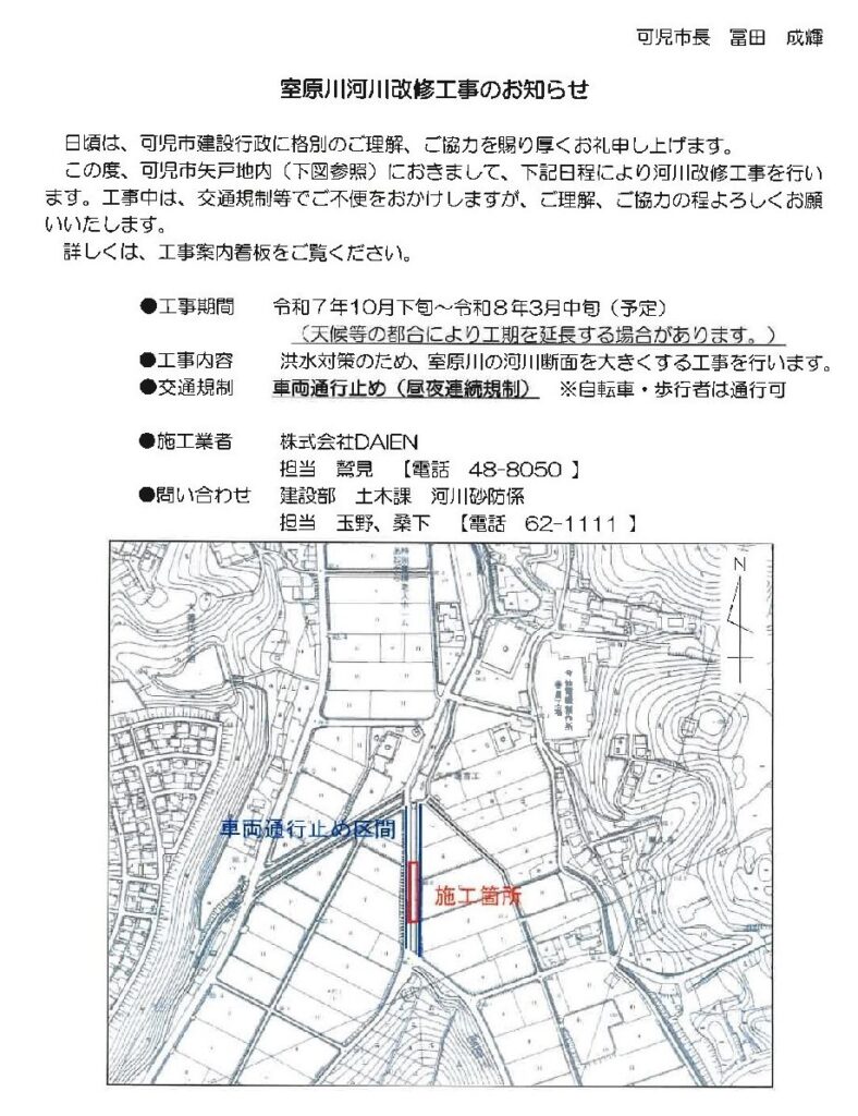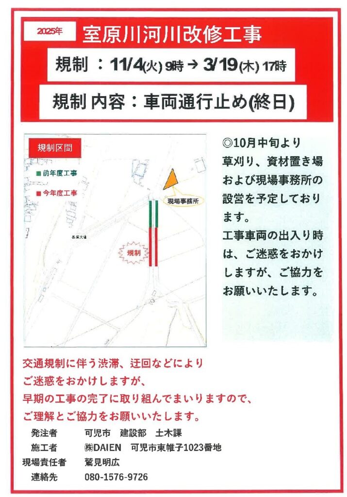 上記日程にて室原川河川改修工事が行われます。